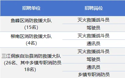 滅火救援戰(zhàn)斗員(4名)、駕駛員(2名)、通訊員(2名),年齡為18-26周歲,消防部隊(duì)退役戰(zhàn)士與本科以上學(xué)歷者,可放寬至30周歲;