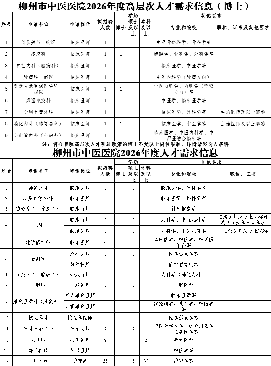 高層次人才不受招聘崗位限制,均可一事一議、一人一議。高層次人才(博士)根據(jù)醫(yī)院引進(jìn)人才制度,給予25萬-120萬元安家費(fèi)、5萬-20萬元科研啟動經(jīng)費(fèi)。引進(jìn)的高層次人才(高級職稱或博士研究生)按柳州市有關(guān)政策提供事業(yè)編制,協(xié)助其解決子女入學(xué)和配偶工作。2026年醫(yī)學(xué)類緊缺人才擬招聘醫(yī)師7人,緊缺人才科室為心理科(精神衛(wèi)生專業(yè))、神經(jīng)外科、急診醫(yī)學(xué)科,擬享受柳州市中醫(yī)醫(yī)院人才引進(jìn)醫(yī)學(xué)類緊缺人才安家費(fèi)2-20萬元,同時按照國家、廣西壯族自治區(qū)、柳州市及醫(yī)院有關(guān)政策享受工資及福利待遇,獎勵性績效工資按照醫(yī)院同級同類人員規(guī)定執(zhí)行。如為學(xué)科帶頭人或高層次人才則另按其標(biāo)準(zhǔn)享受相關(guān)待遇。