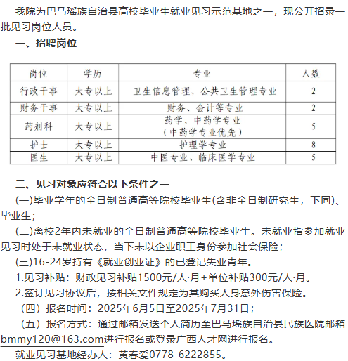 原文標題:巴馬瑤族自治縣民族醫(yī)院2025年見習崗位招聘公告