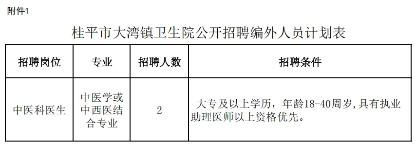 附件:1.桂平市大灣鎮(zhèn)衛(wèi)生院公開(kāi)招聘編外工作人員計(jì)劃表