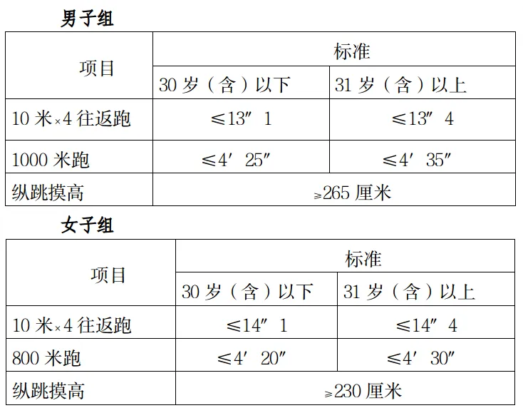 測評結(jié)果分為合格和不合格。一般體能測評三項成績均達(dá)標(biāo)的方為合格,其中具有研究生及以上學(xué)歷報考人員,體能測評三個項目中有任何兩項達(dá)標(biāo)的,即視為合格。體能測試時間、地點:另行通知。