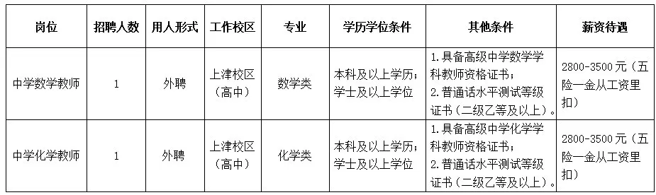 根據(jù)學(xué)校工作需要,南寧市第十中學(xué)上津校區(qū)(高中部)面向社會招聘教職工,具體崗位如下: