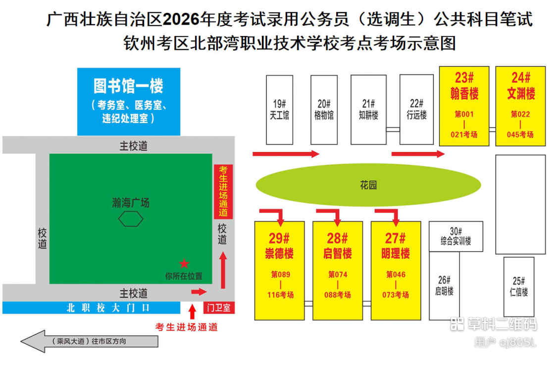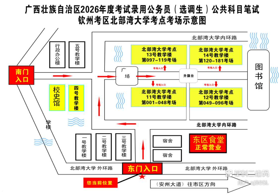 欽州考區(qū)共設(shè)三個(gè)考點(diǎn),分別為北部灣大學(xué)考點(diǎn)、北部灣職業(yè)技術(shù)學(xué)??键c(diǎn)、欽州市第五中學(xué)考點(diǎn)。(考點(diǎn)地址和具體考場(chǎng)安排請(qǐng)掃附后的二維碼查看)