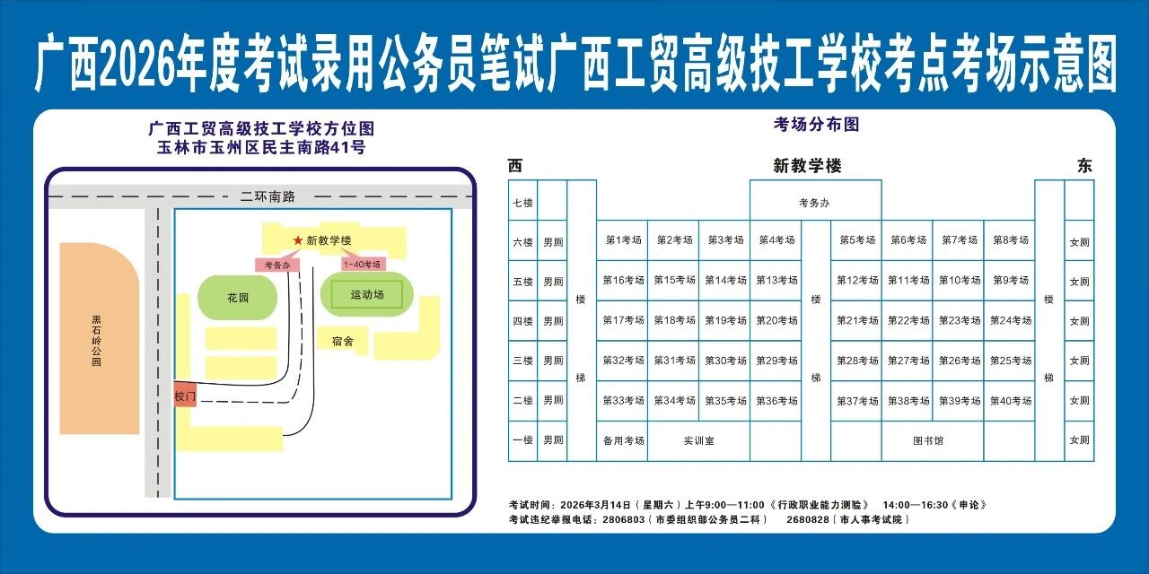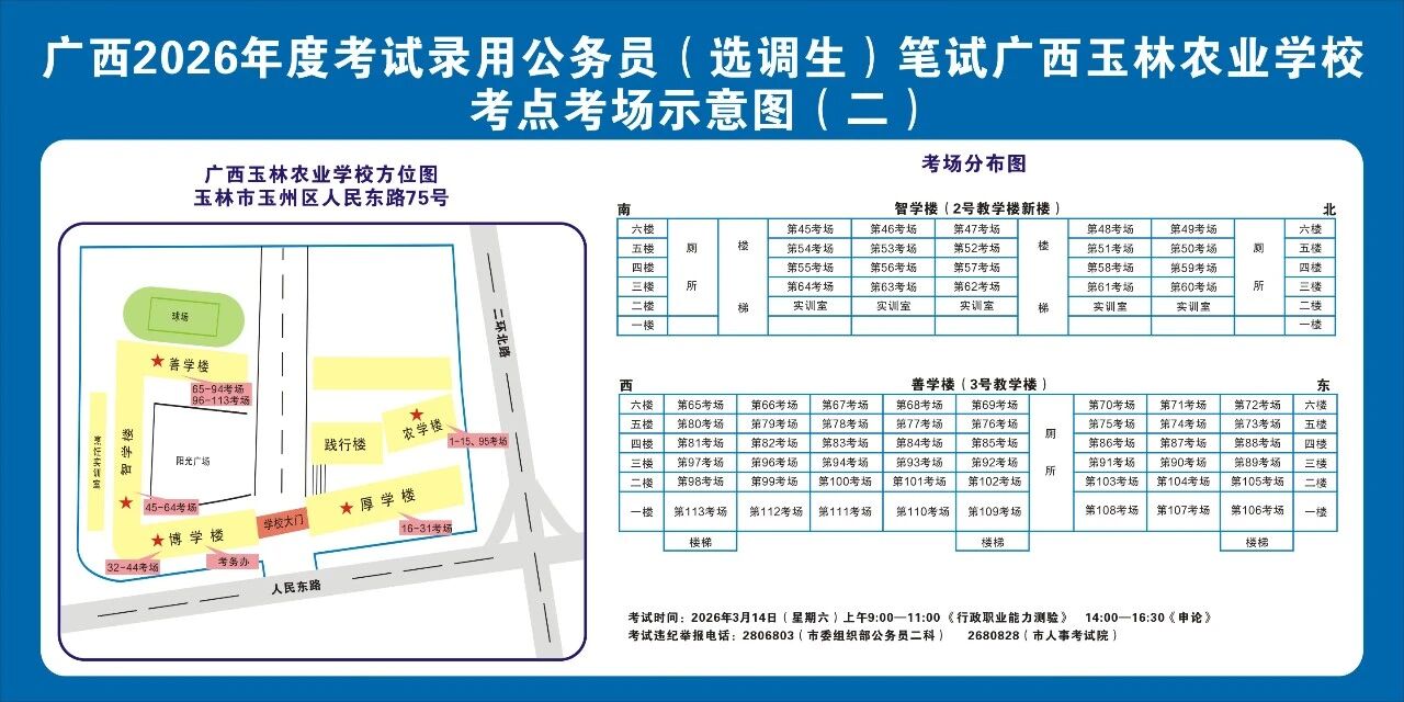 廣西2026年度考試錄用公務(wù)員(選調(diào)生)筆試將于3月14日舉行,為進(jìn)一步提升玉林考區(qū)服務(wù)保障質(zhì)量,現(xiàn)就有關(guān)注意事項(xiàng)提示如下,請(qǐng)廣大考生做好應(yīng)試準(zhǔn)備工作,準(zhǔn)確掌握考試時(shí)間、考點(diǎn)地址及相關(guān)注意事項(xiàng)。