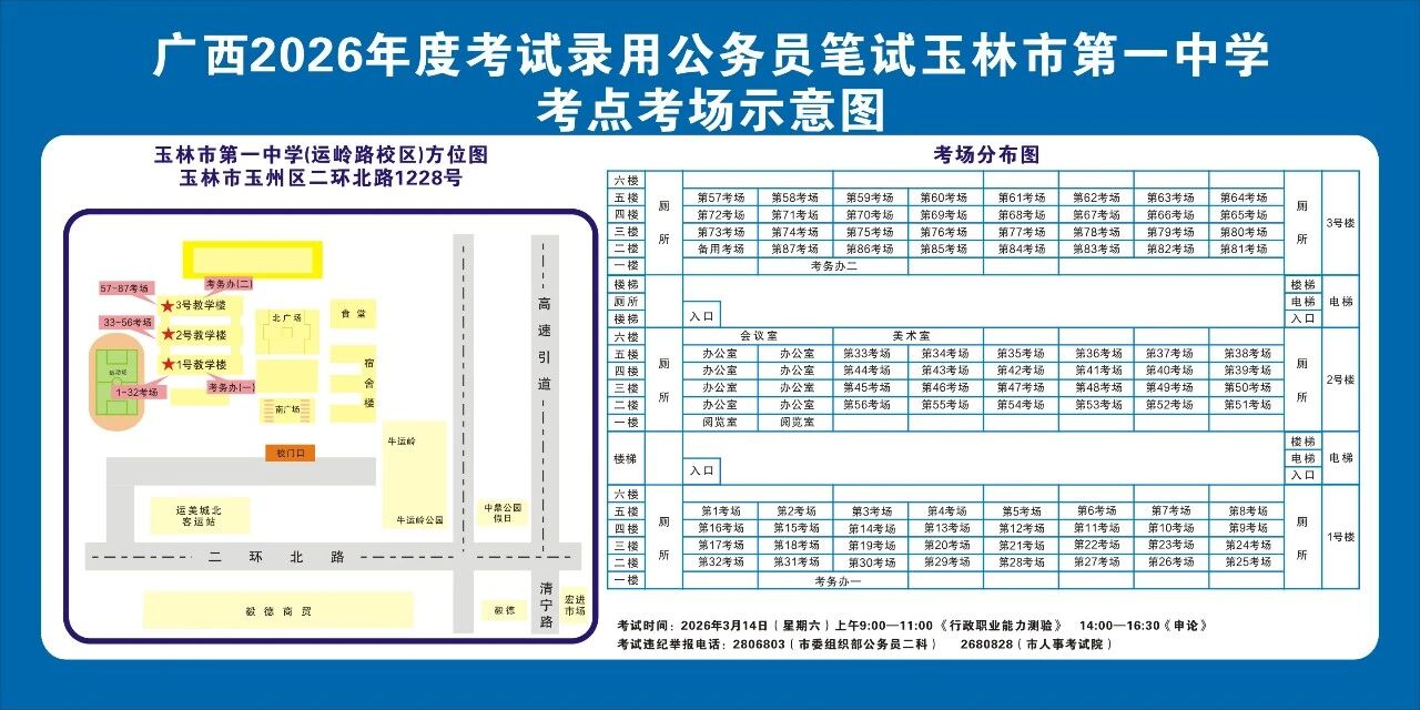 玉林市第一中學(xué)(運(yùn)嶺路校區(qū))考點(diǎn)11:00-12:00,16:30-17:30 在考點(diǎn)安排公交車和值勤人員,負(fù)責(zé)將考生接送到玉林汽車總站。