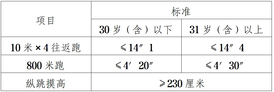 按照《關(guān)于印發(fā)〈公安機關(guān)錄用人民警察體能測評項目和標(biāo)準(zhǔn)〉的通知》(公政治〔2024〕60號)執(zhí)行。體能測評項目包括10米×4往返跑、1000米(男)/800米(女)跑、縱跳摸高等3個項目。其中,綜合管理類、執(zhí)法勤務(wù)類職位測查全部3個項目,警務(wù)技術(shù)類職位免予測查1000米(男)/800米(女)跑項目;對于專業(yè)人才緊缺難以形成競爭的特殊職位(緊缺職位),報考人員需在參加體能測評前,從3項體能測評項目中選擇2項參加測試。凡應(yīng)測項目中任意一項不達(dá)標(biāo)的,即為體能測評不合格。具體如下: