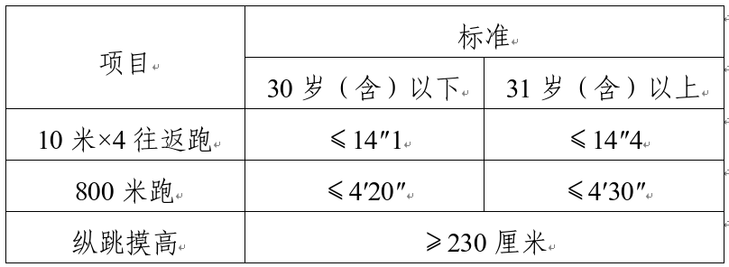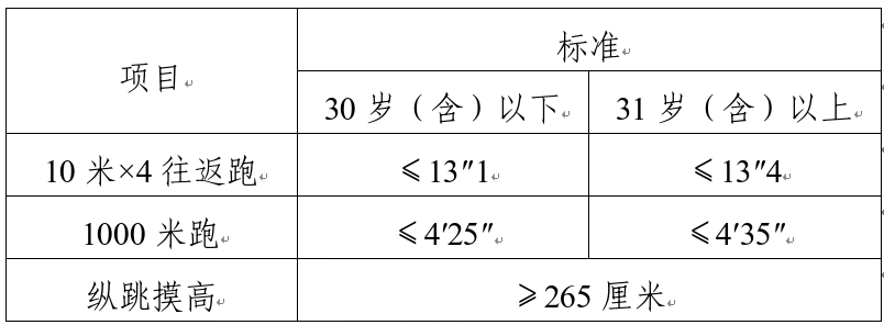 綜合管理類、執(zhí)法勤務類職位測查全部三個項目,三項全部達標方為合格;警務技術類職位免予測查1000米(男)/800米(女)跑項目,其他兩項全部達標方為合格;報考外語及少數(shù)民族語言翻譯緊缺職位的人員,體能測評三項中有兩項達標的,視為合格。